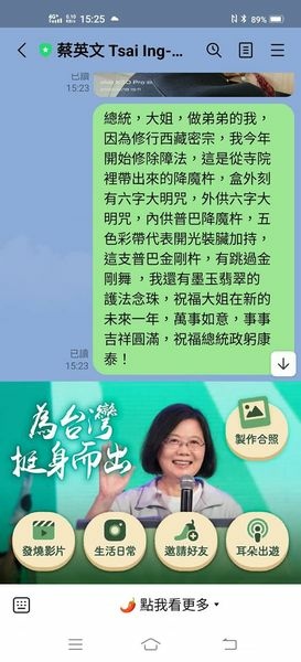 總統,大姐,做弟弟的我,因為修行西藏密宗,我今年開始修除障法,這是從寺院裡帶出來的降魔杵,盒外刻有六字大明咒,外供六字大明咒,內供普巴降魔杵,五色彩帶代表開光裝臟加持,這支普巴金剛杵,有跳過金剛舞 ,我還有墨玉翡翠的護法念珠,祝福大姐在新的未來一年,萬事如意,事事吉祥圓滿,祝福總統政躬康泰!